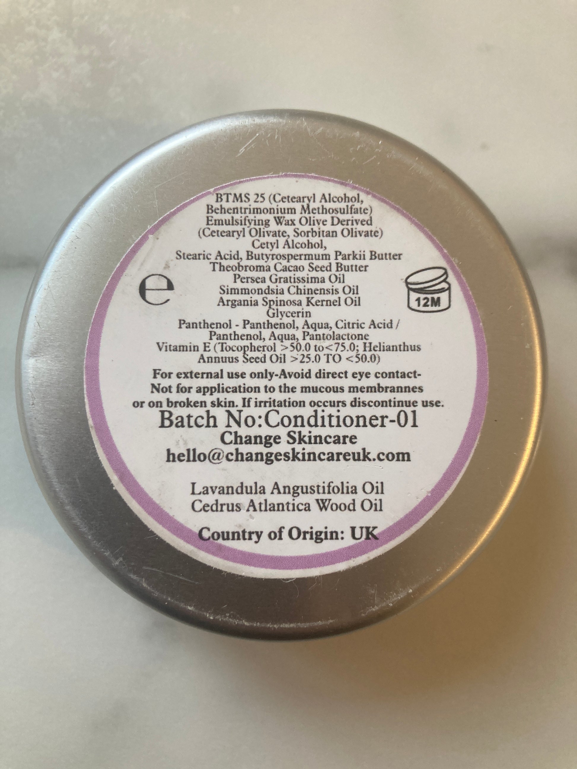 BTMS 25, Cetyl Alcohol, Emulsifying Wax Olive derived, Butyrospermum Parkii Butter, Theobroma Cacao Seed Butter, Glycerin, Stearic Acid, Persea Gratissima Oil, Simmondsia Chinesis Seed Oil, Argania Spinosa Kernal OIl, Panthenol, Lavandula Angustifolia Oil, Cedrus Atlantica Wood Oil