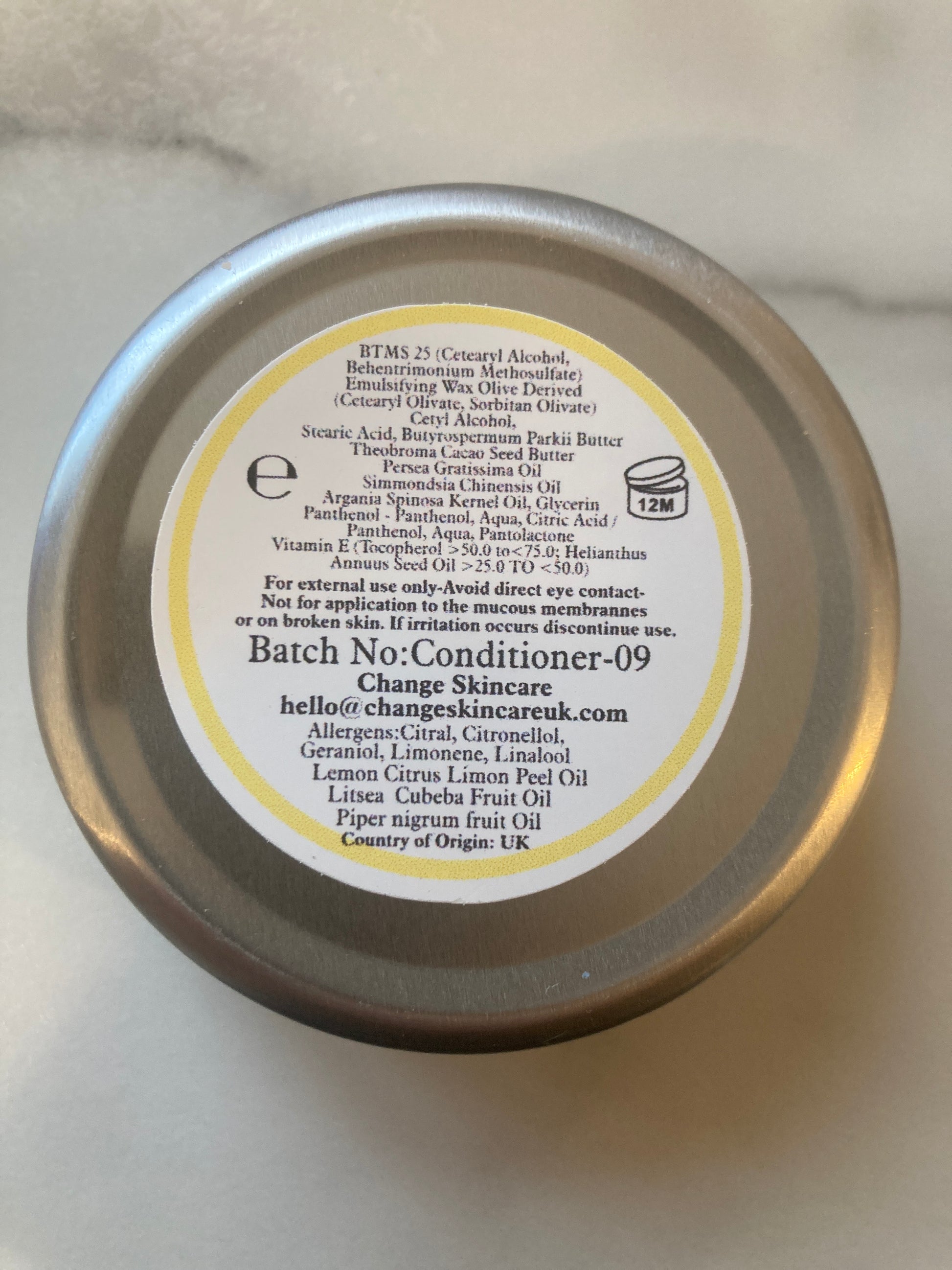 BTMS 25, Cetyl Alcohol, Emulsifying Wax Olive derived, Butyrospermum Parkii Butter, Theobroma Cacao Seed Butter, Glycerin, Stearic Acid, Persea Gratissima Oil, Simmondsia Chinesis Seed Oil, Argania Spinosa Kernal OIl, Panthenol, Citrus Limon Peel Oil, Piper Nigum Fruit Oil, Litsea Cubeba Fruit Oil
