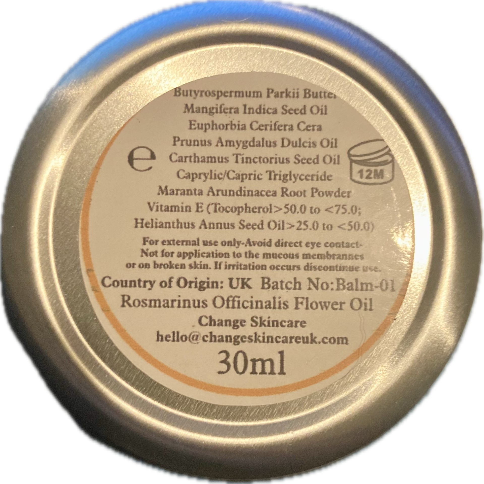 Ingredients; Butyrospermum Parkii Butter, Prunus Amygdalus Dulcis Oil, Mangifera Indica Seed Oil, Carthamus Tinctorius Seed Oil, EuphorbiaCerifera Cera, Caprylic / Capric Trilyceride, Maranta Aruninacea Root Powder, Rosemarinus Officinalis Leaf Oil, Vitamin E